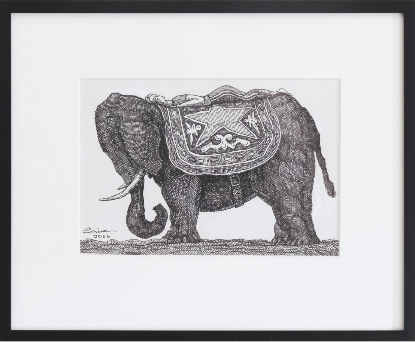 Acrobat Resting on an Elephant, 2018, Pen & Ink on Paper, 10.5 x 12.75 in. Drawing 5.25 x 7.75 in.